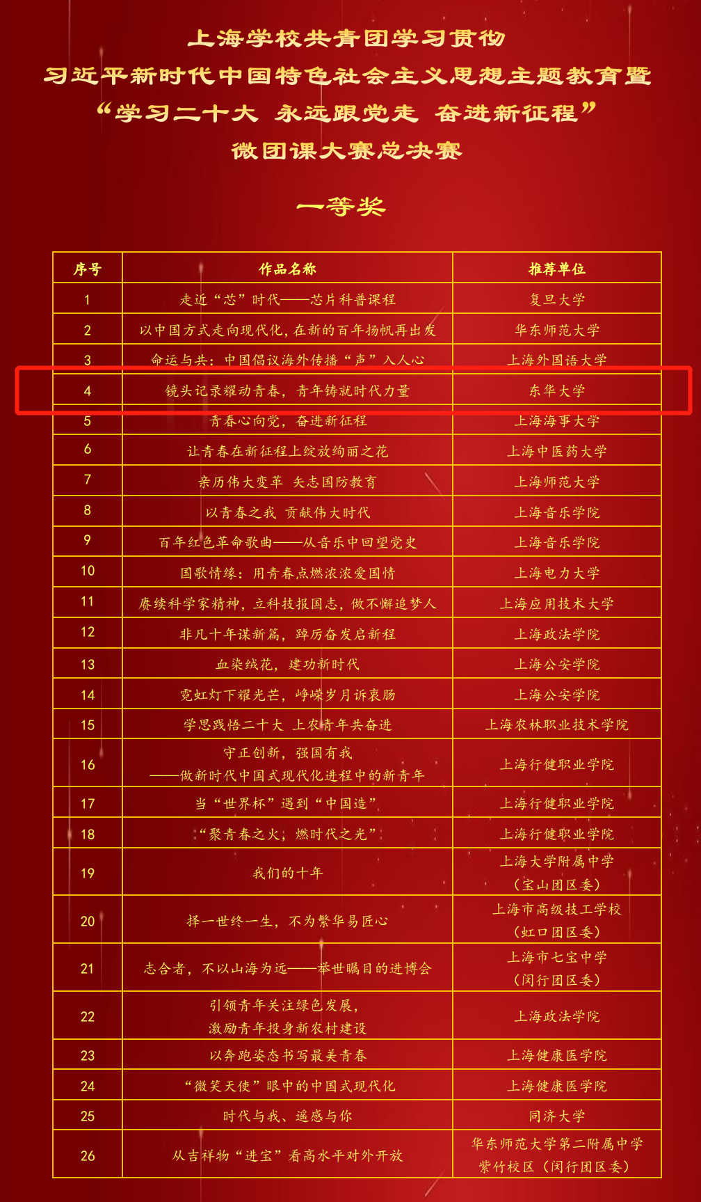 2023年6月29日,由共青团上海市委员会、上海市学生联合会主办的上海学校共青团学习贯彻习近平新时代中国特色社会主义思想主题教育暨“学习二十大 永远跟党走 奋进新征程”微团课主题大赛总决赛在华东师范大学举行。